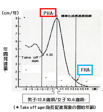 11~13歳の成長スパートである、身長最大発育年齢(PHA)(男子:12.8歳頃/女子10.6歳頃)を迎え、身長最終発育年齢(FHA)までの時期は、骨の長径成長速度が筋肉・など周囲組織の成長速度より速く、骨・筋肉・腱の成長が不均衡になる。