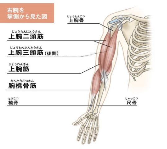 ① 肘を曲げる筋 上腕筋、上腕二頭筋、腕橈骨筋がある