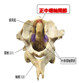 脊柱のなかでも環椎(C1)と軸椎(C2)に最も多く起こります。軸椎歯突起周囲に パンヌスが増生し炎症による破壊が進行。 骨びらんや骨融解が生じ、環椎横靭帯が 弛緩し環軸関節亜脱臼が起こる。