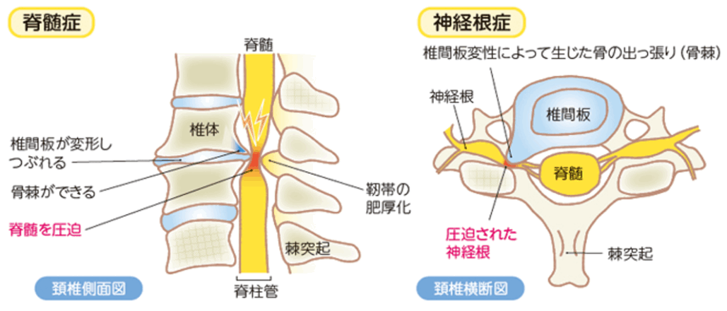 結果、脊髄自体が圧迫されて症状を引き起こします。