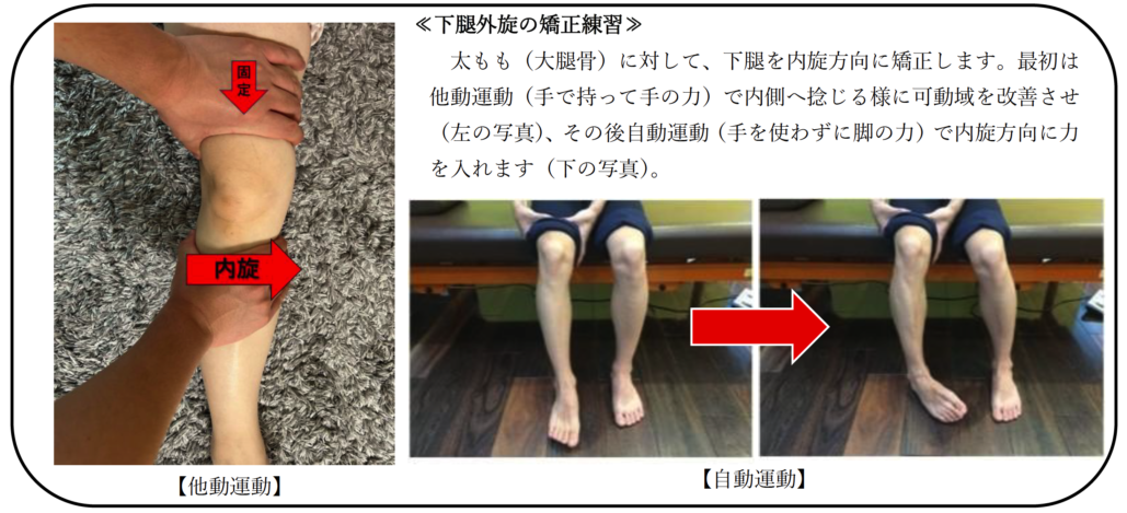下腿外旋症候群とは、大腿骨に対して下腿(脛骨)が外に捻じれている、つまり外旋していることを言います。下腿外旋位になると膝の十字靭帯の交叉が解ける姿勢になるので、膝関節は不安定になります。また、膝屈曲位になることが多いので内外側の側副靭帯も緩む形になり、不安定性はさらに助長されます。不安定なままの関節への荷重は、膝関節障害の誘発因子になりえます。